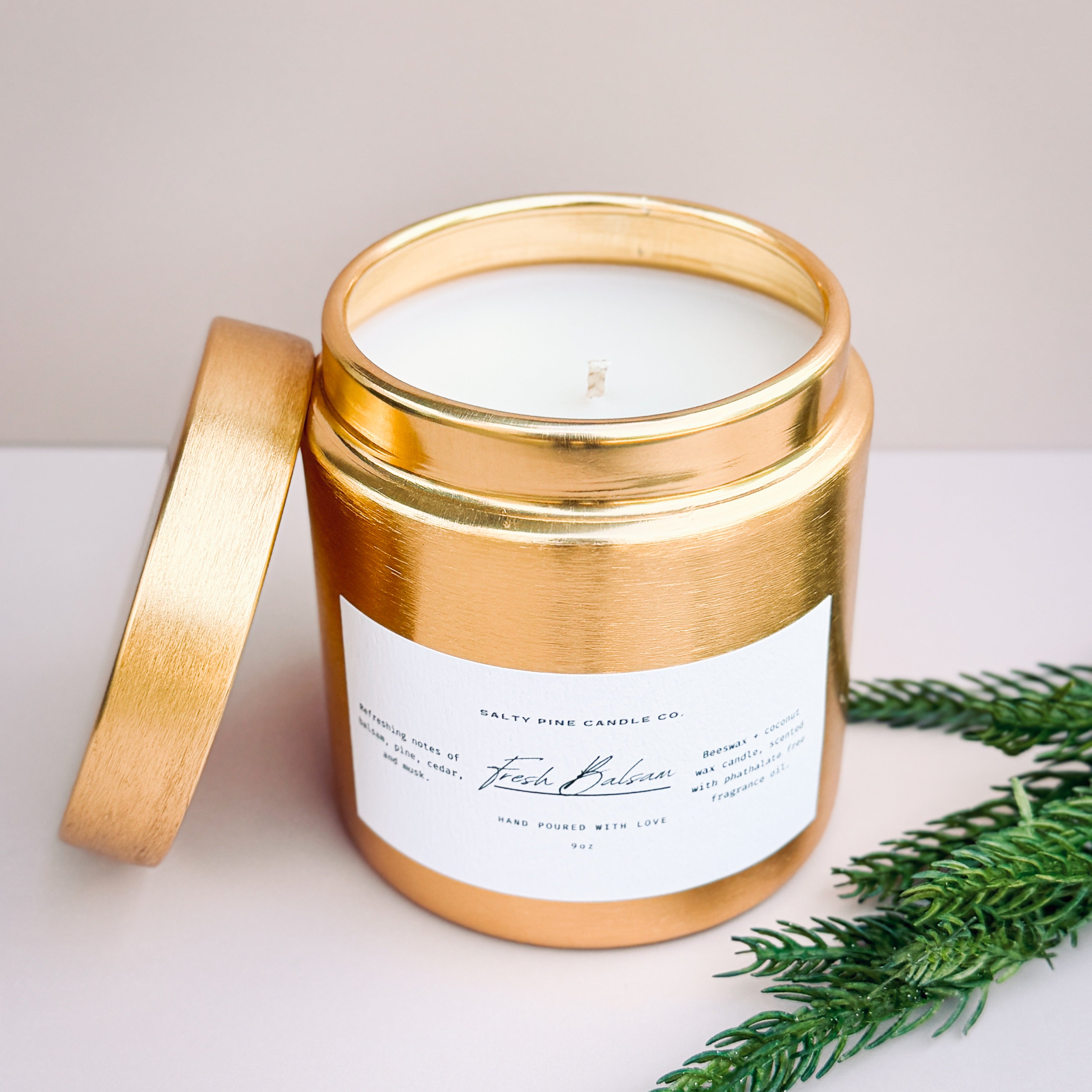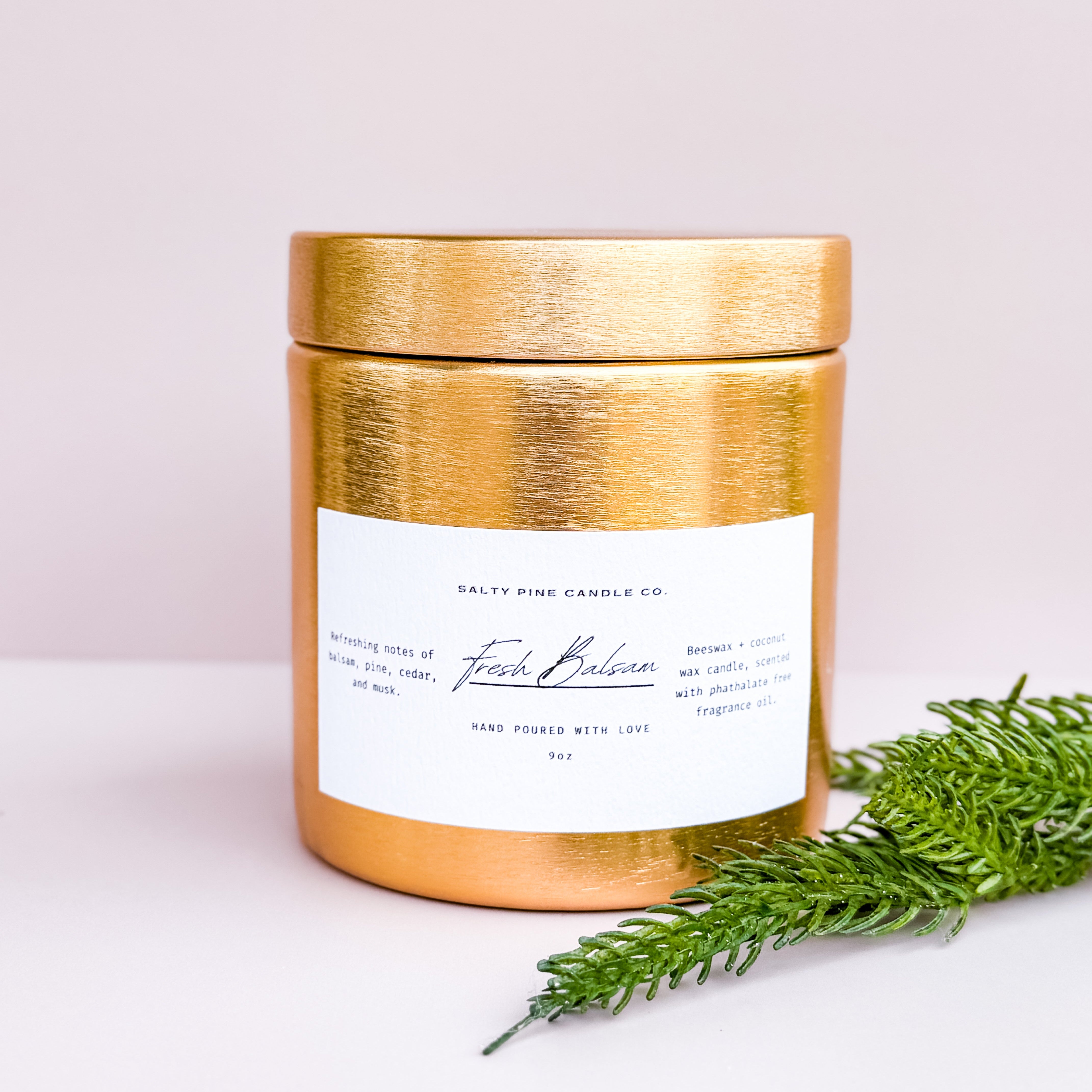 Bring the peaceful calm of the forest into your home with our Fresh Balsam 9oz Gold Tin Candle. This captivating scent smells like a weekend walk through tall evergreens—refreshing balsam, crisp pine, and rich cedar are grounded with soft greens and a touch of warm musk.